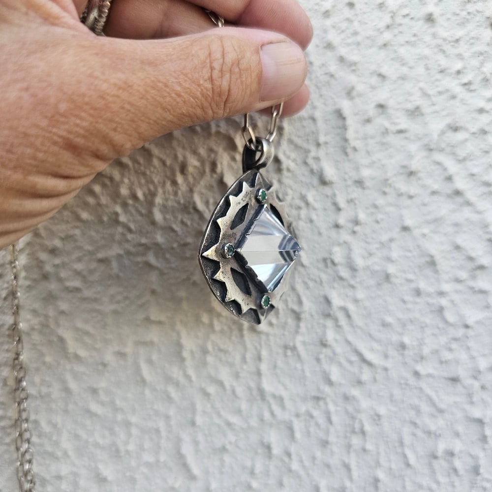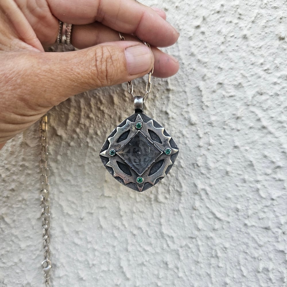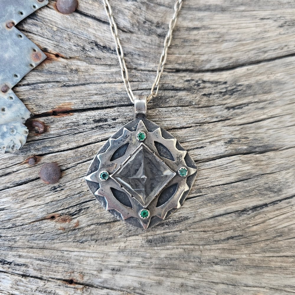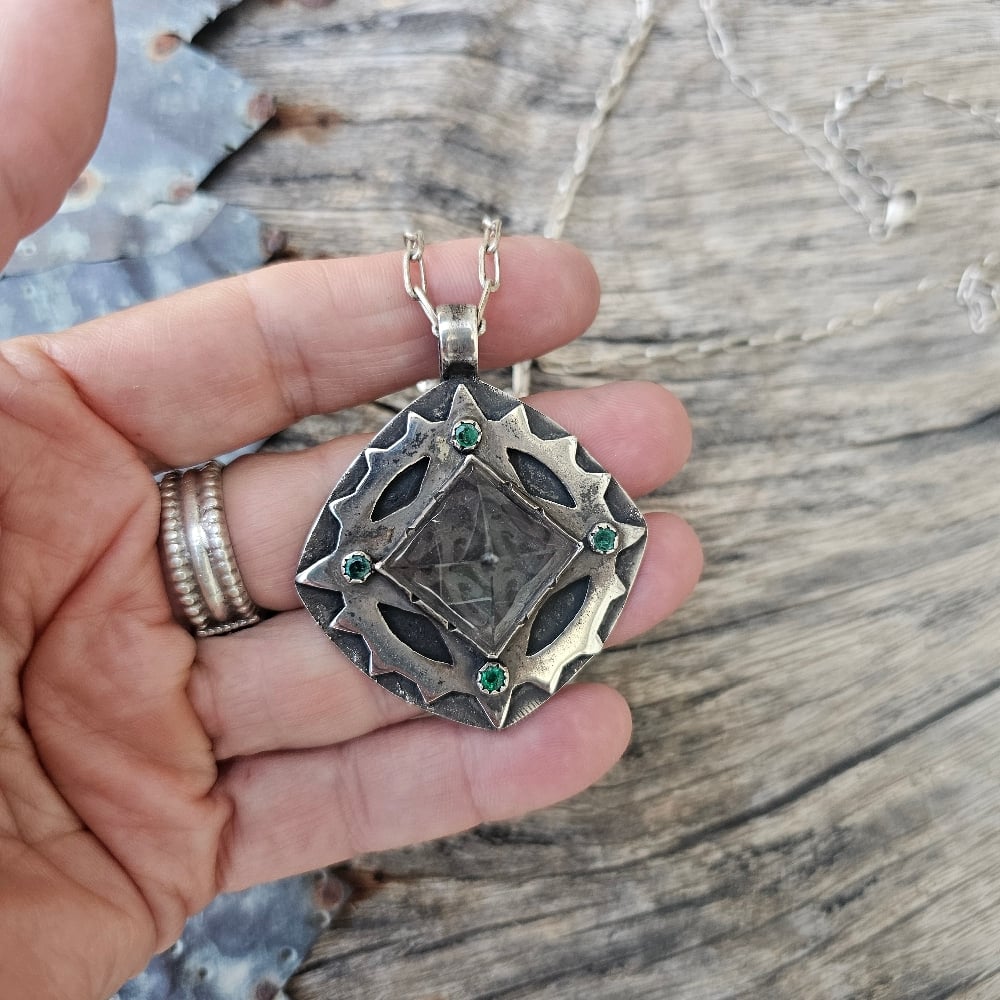 A vintage pendant purchased in Afghanistan in the early 60's, this heavy silver pendant is quite unusual. Set with four emeralds around a central crystal pyramid on a solid plate of silver. Underneath the crystal is engraved a symbol of sorts.
