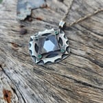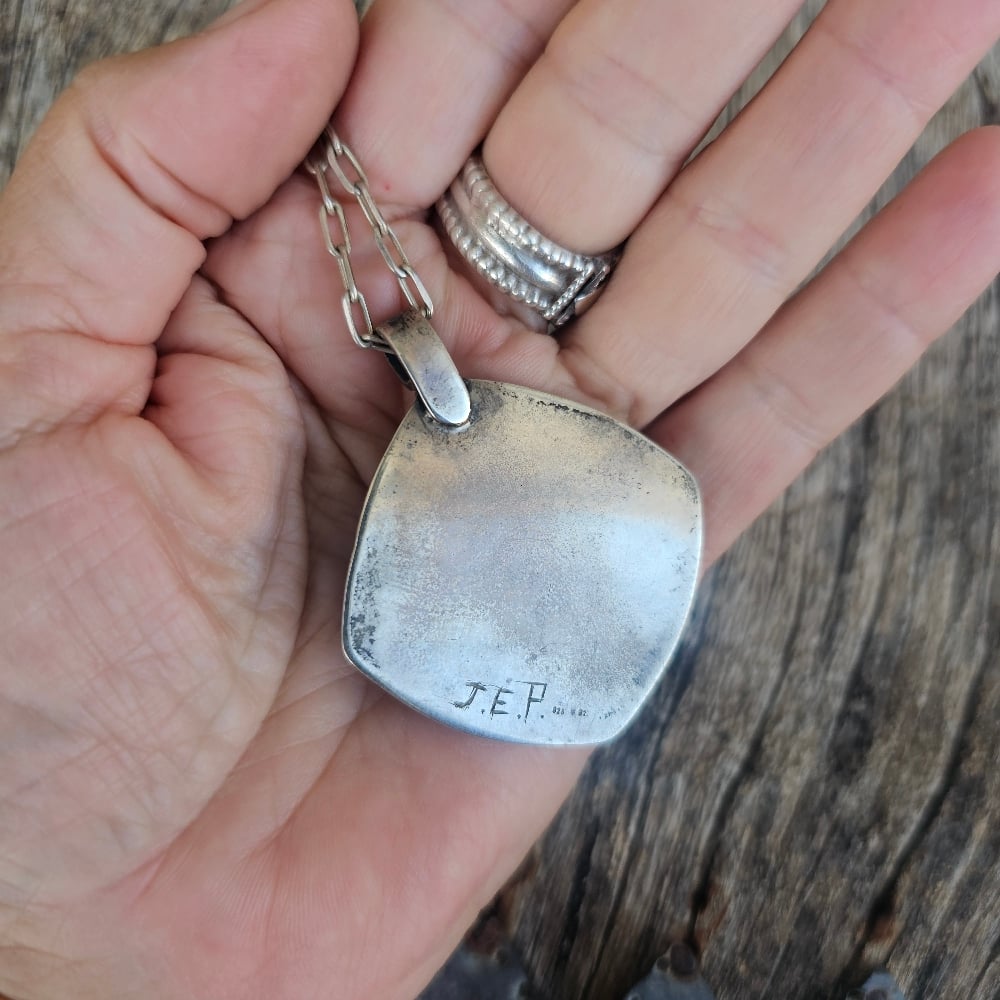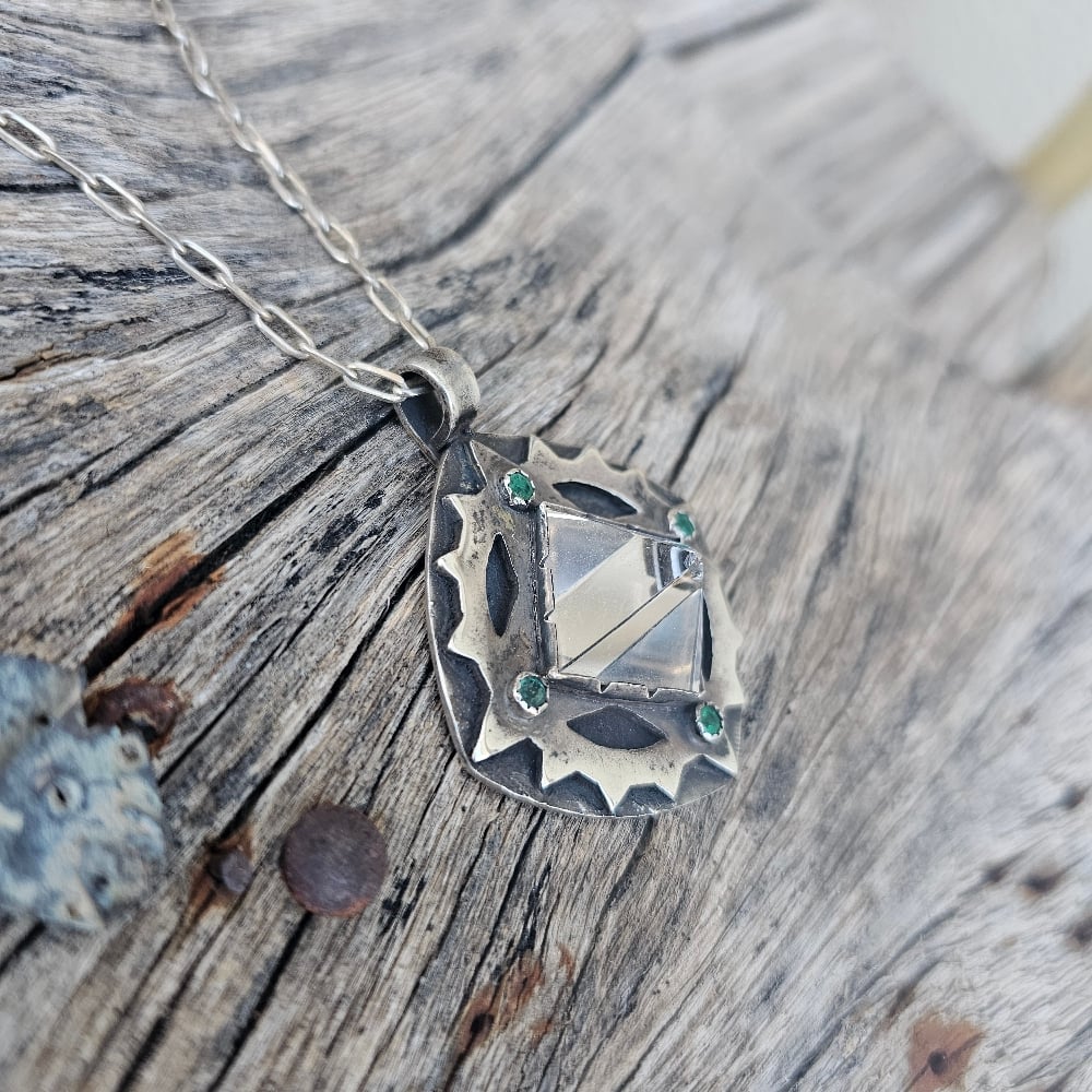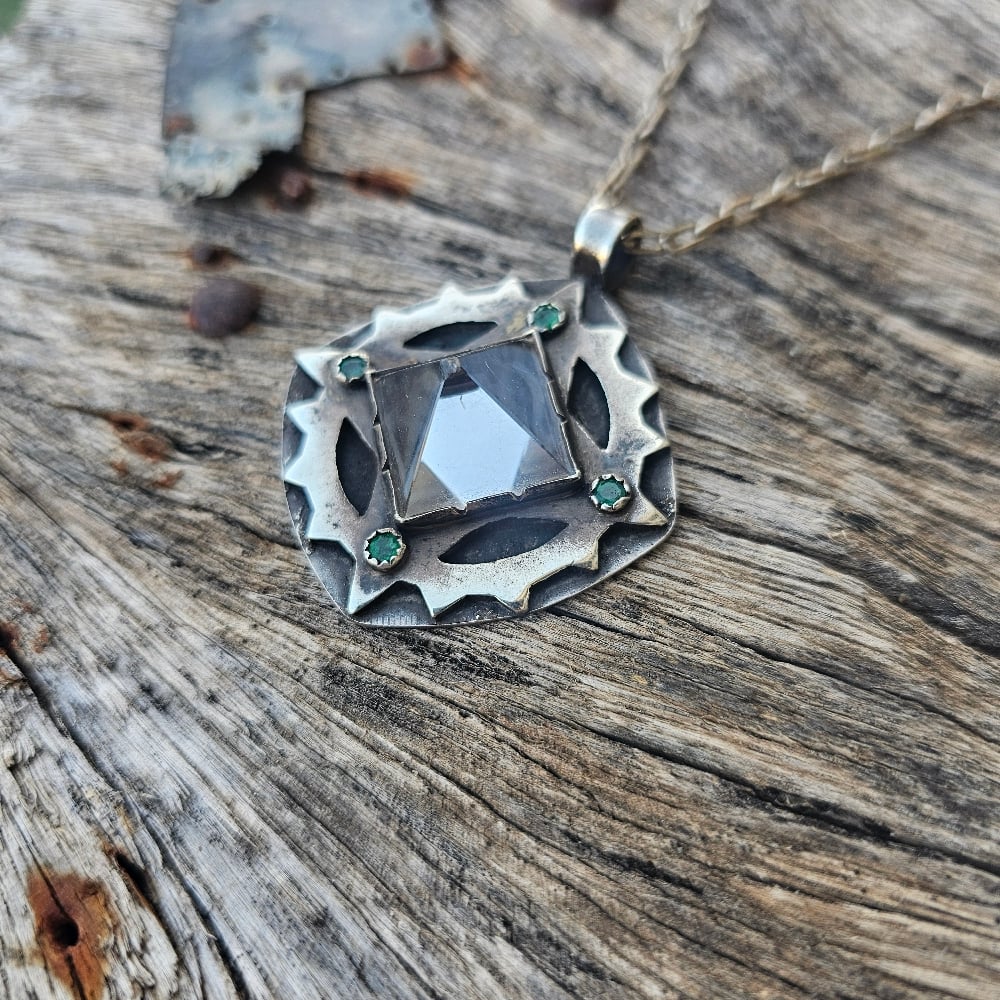 A vintage pendant purchased in Afghanistan in the early 60's, this heavy silver pendant is quite unusual. Set with four emeralds around a central crystal pyramid on a solid plate of silver. Underneath the crystal is engraved a symbol of sorts.