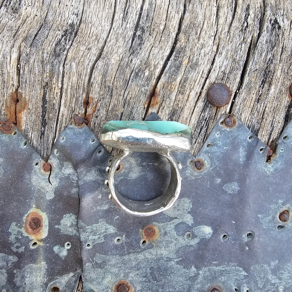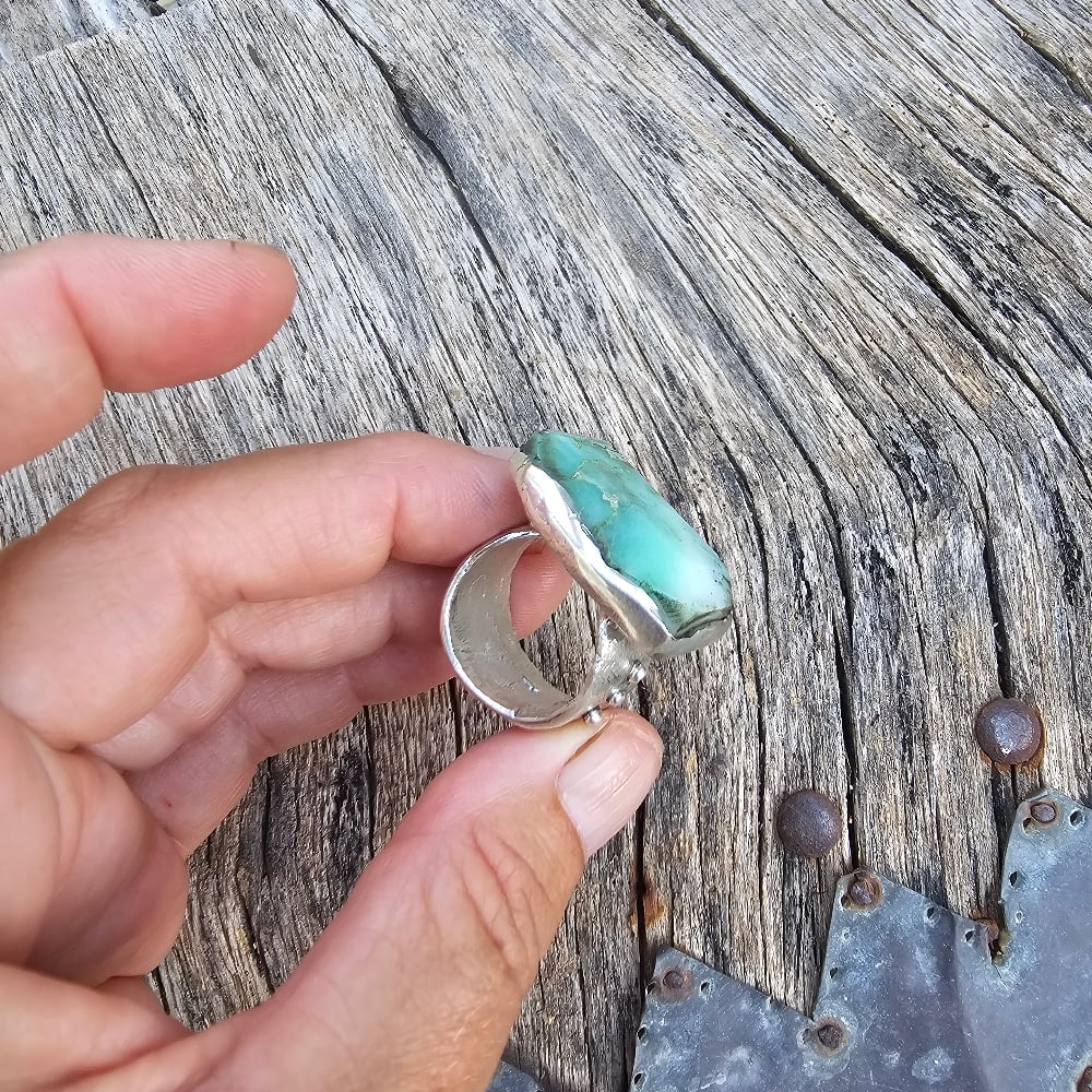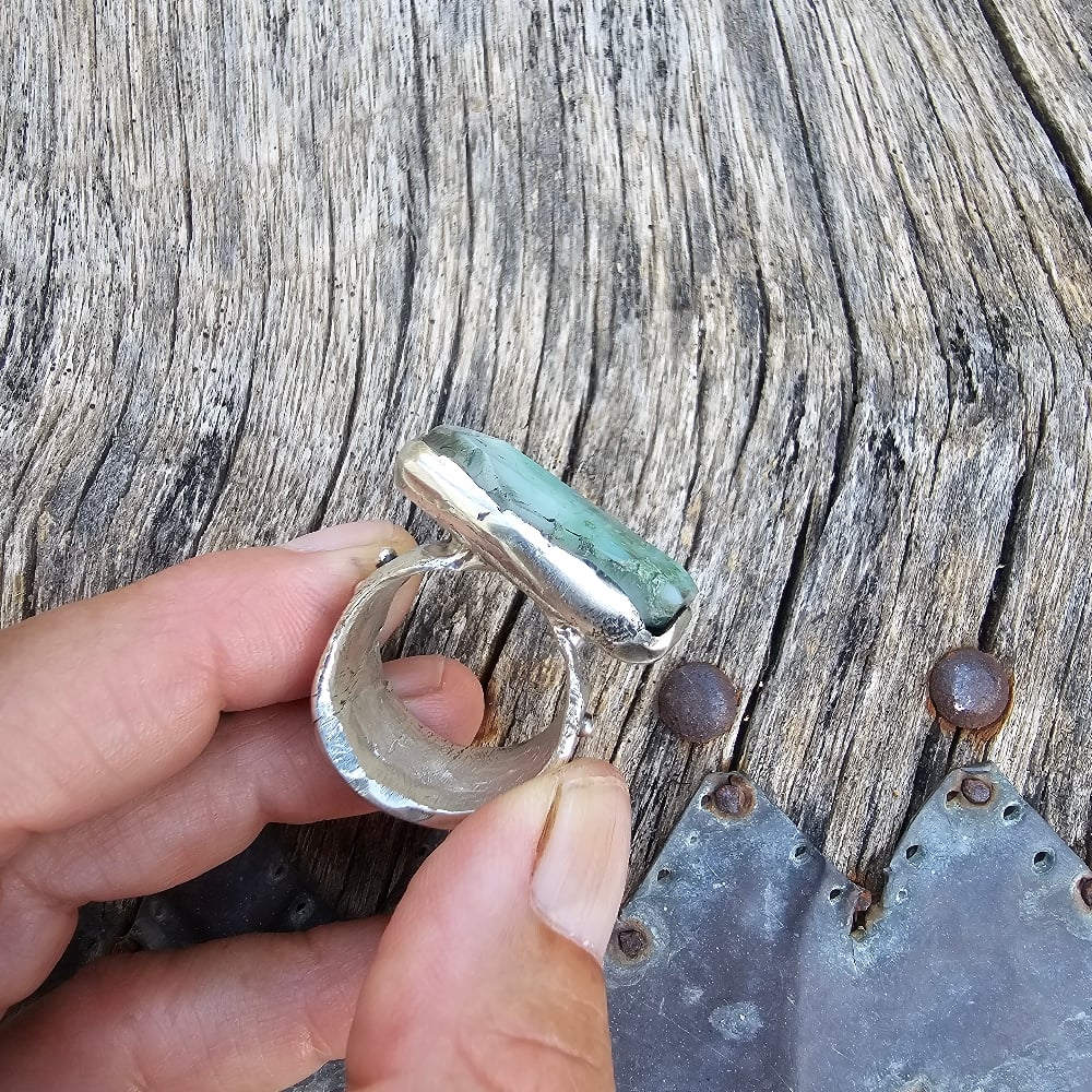 A beautiful faceted rectanglar slab of natural, matt polished chrysoprase set in chunky sterling silver in my signature raw style wabi sabi aesthetic.