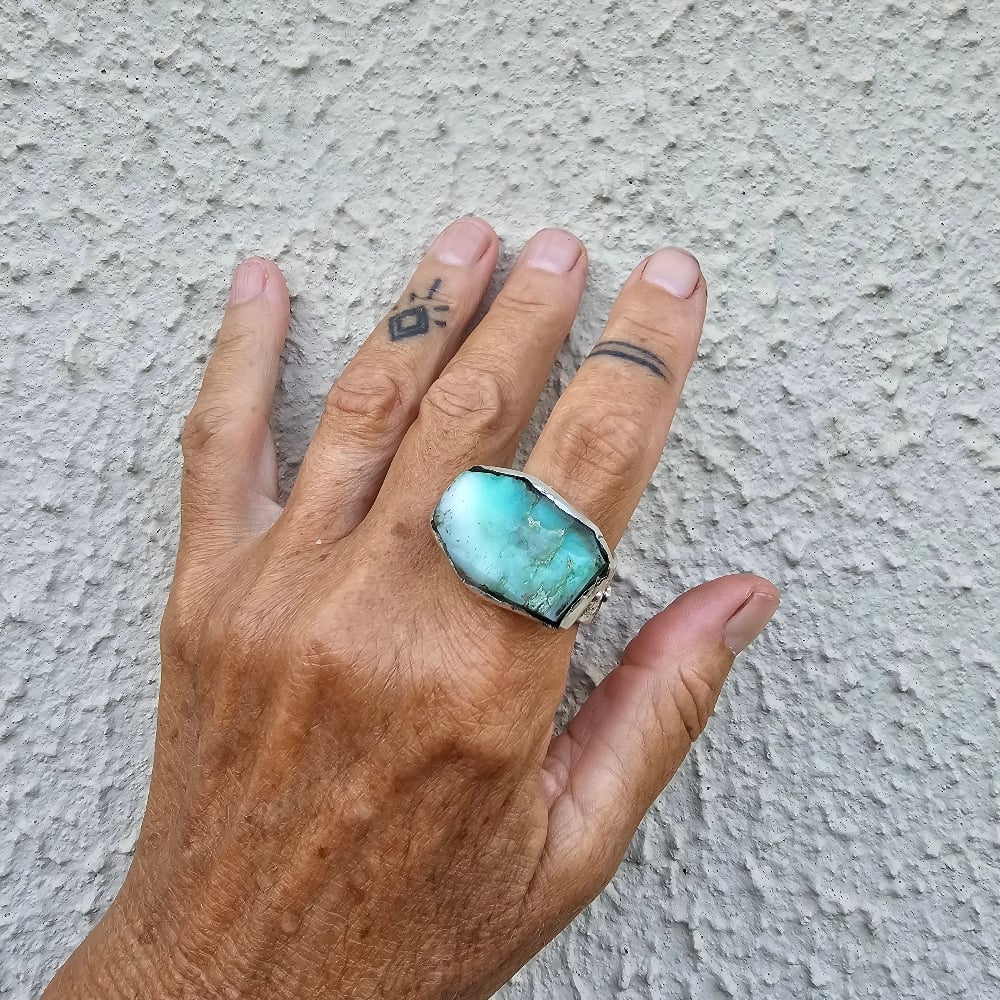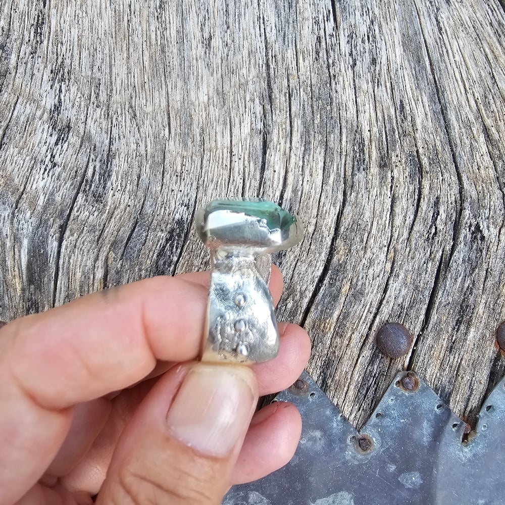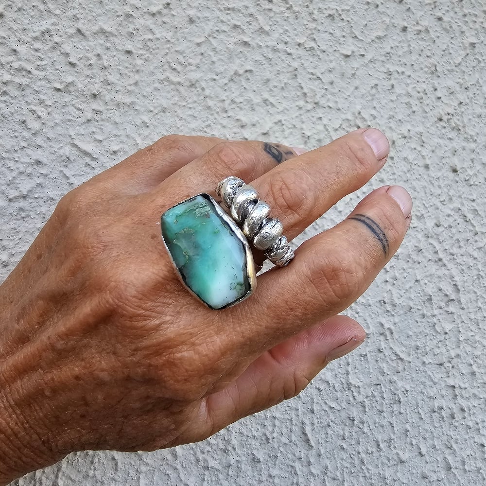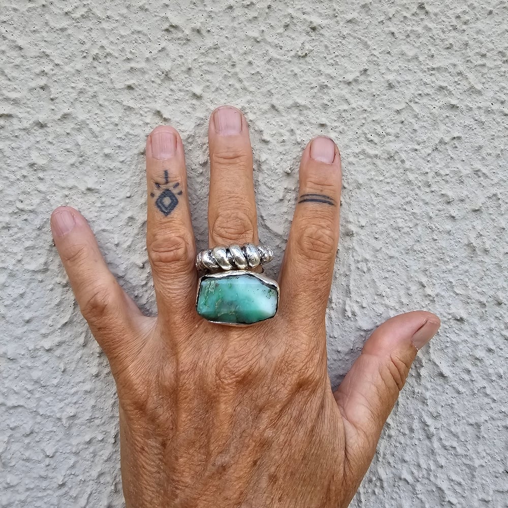 A beautiful faceted rectanglar slab of natural, matt polished chrysoprase set in chunky sterling silver in my signature raw style wabi sabi aesthetic.
