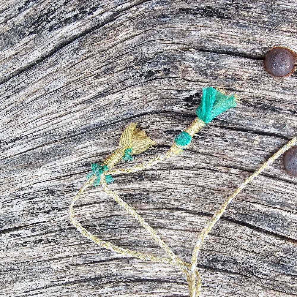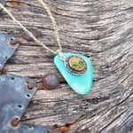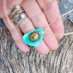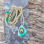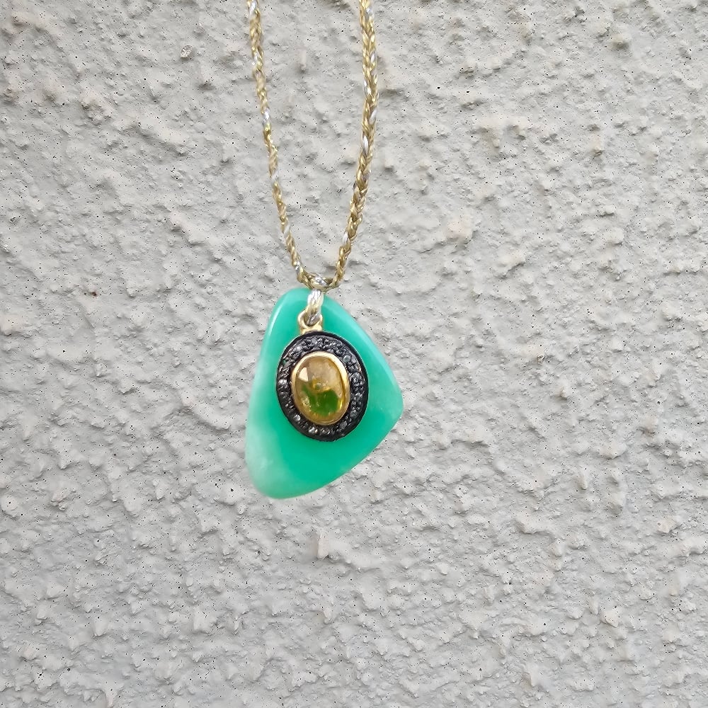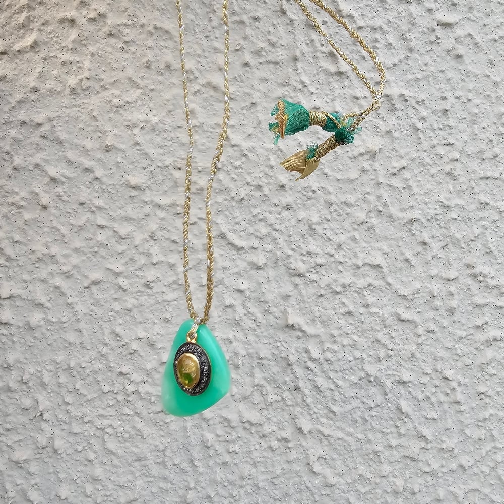 Polished slice of pretty coloured chrysoprase overlaid with a yellow tourmaline and diamond piece and strung on hand woven golden macrame cord with upcycled silk details.