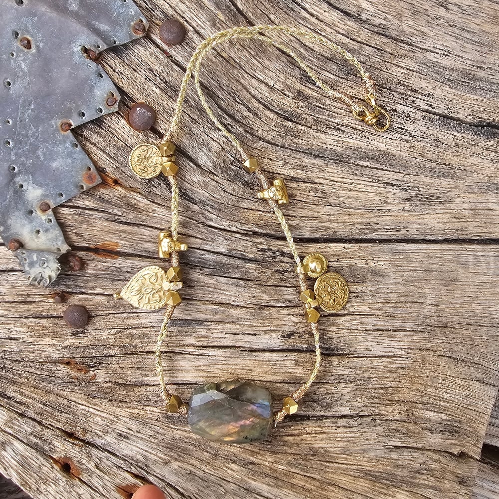 Handwoven cord necklace with a central faceted labradorite and brass amulets along the length including a lotus flower, Hanuman and Shiva.