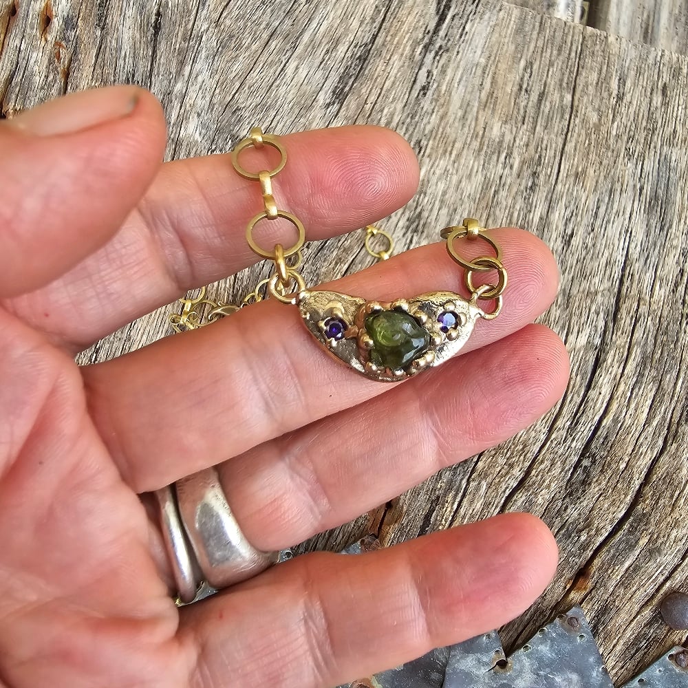 Lil encrusted bar with rough peridot and amethyst CZ crystal details, is the centre piece of this necklace in raw brass.