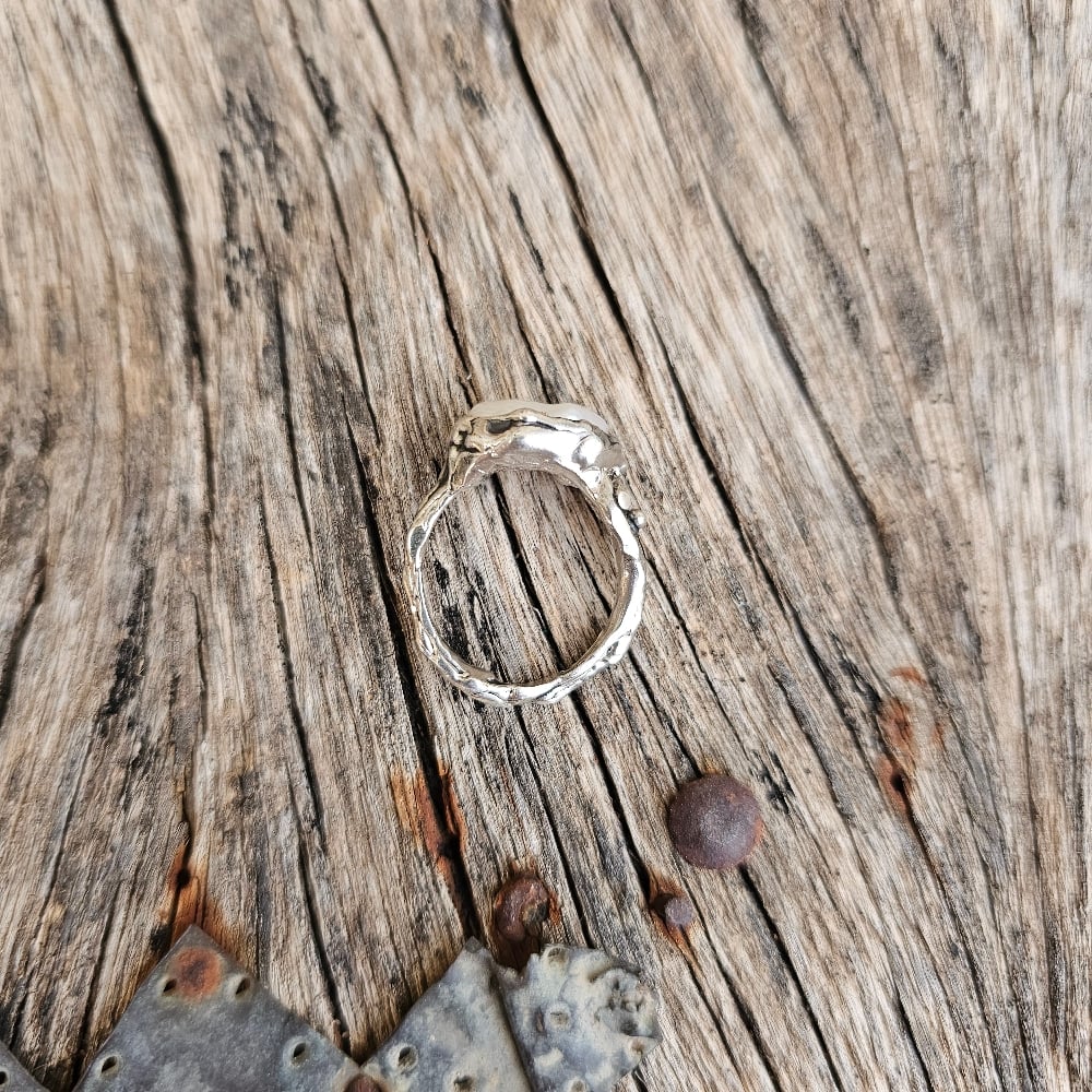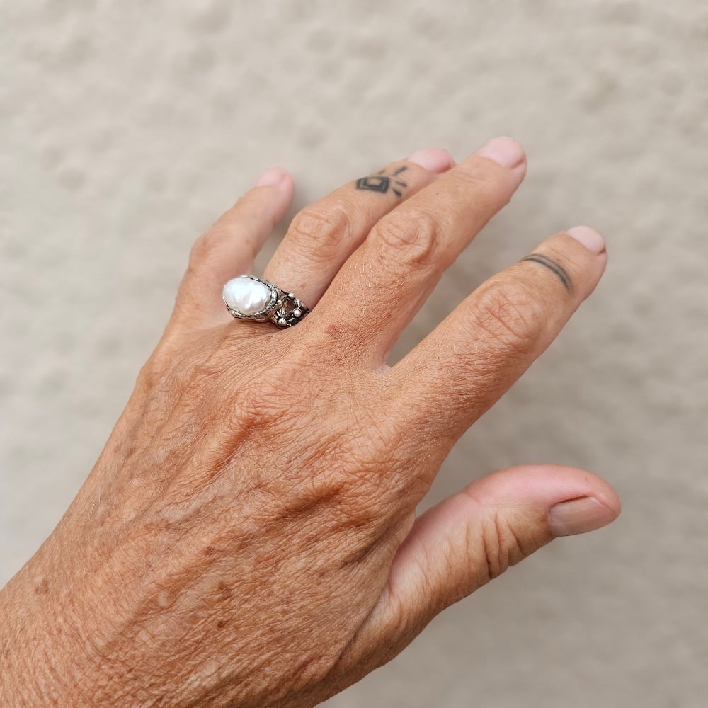 Sterling silver fresh water pearl ring in with lemon quartz crystal detail, made in my signature wabi sabi aesthetic.