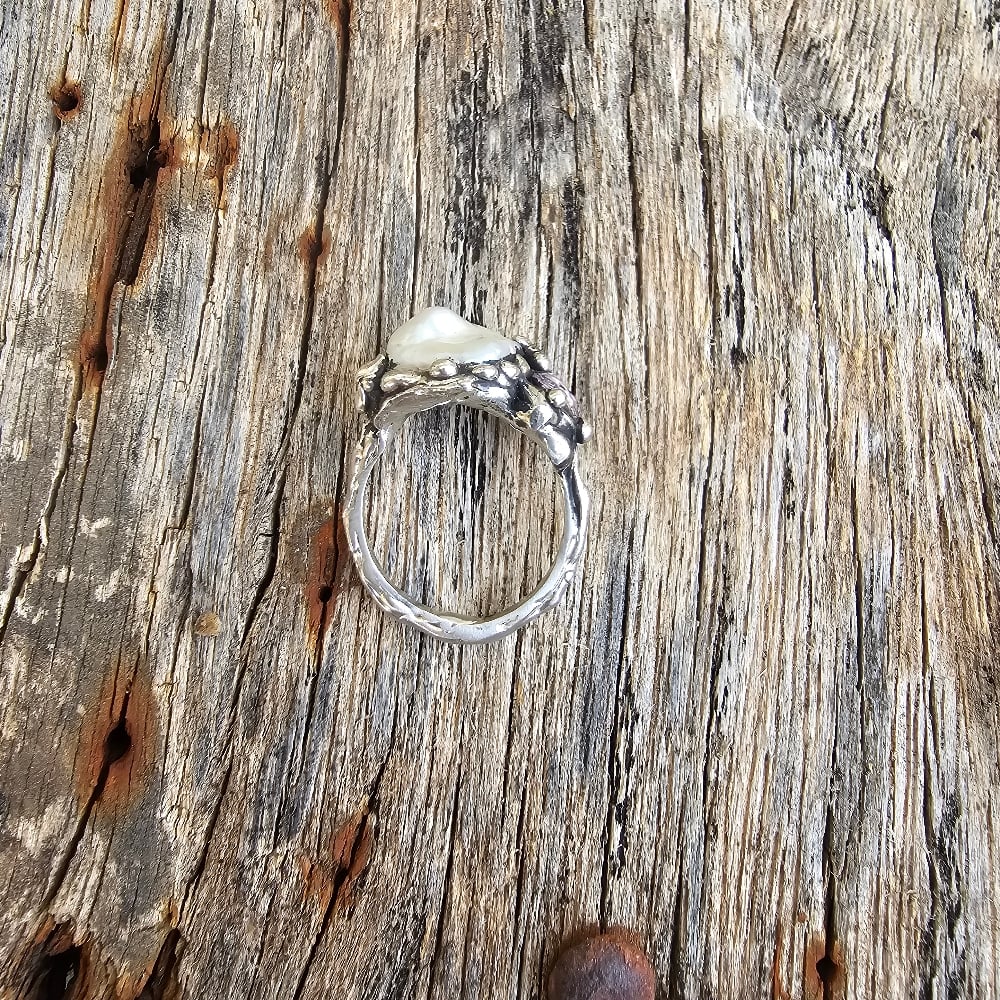 Sterling silver fresh water pearl ring in with amethyst crystal detail, made in my signature wabi sabi aesthetic.