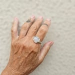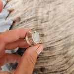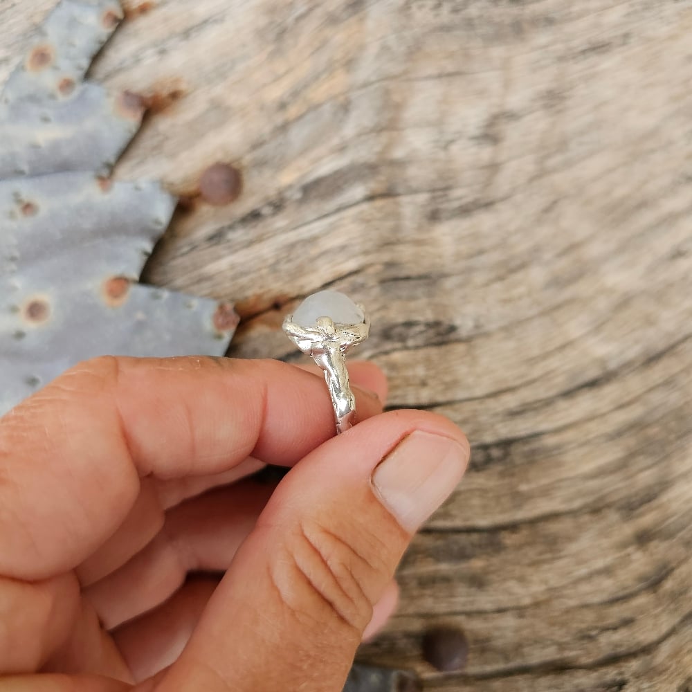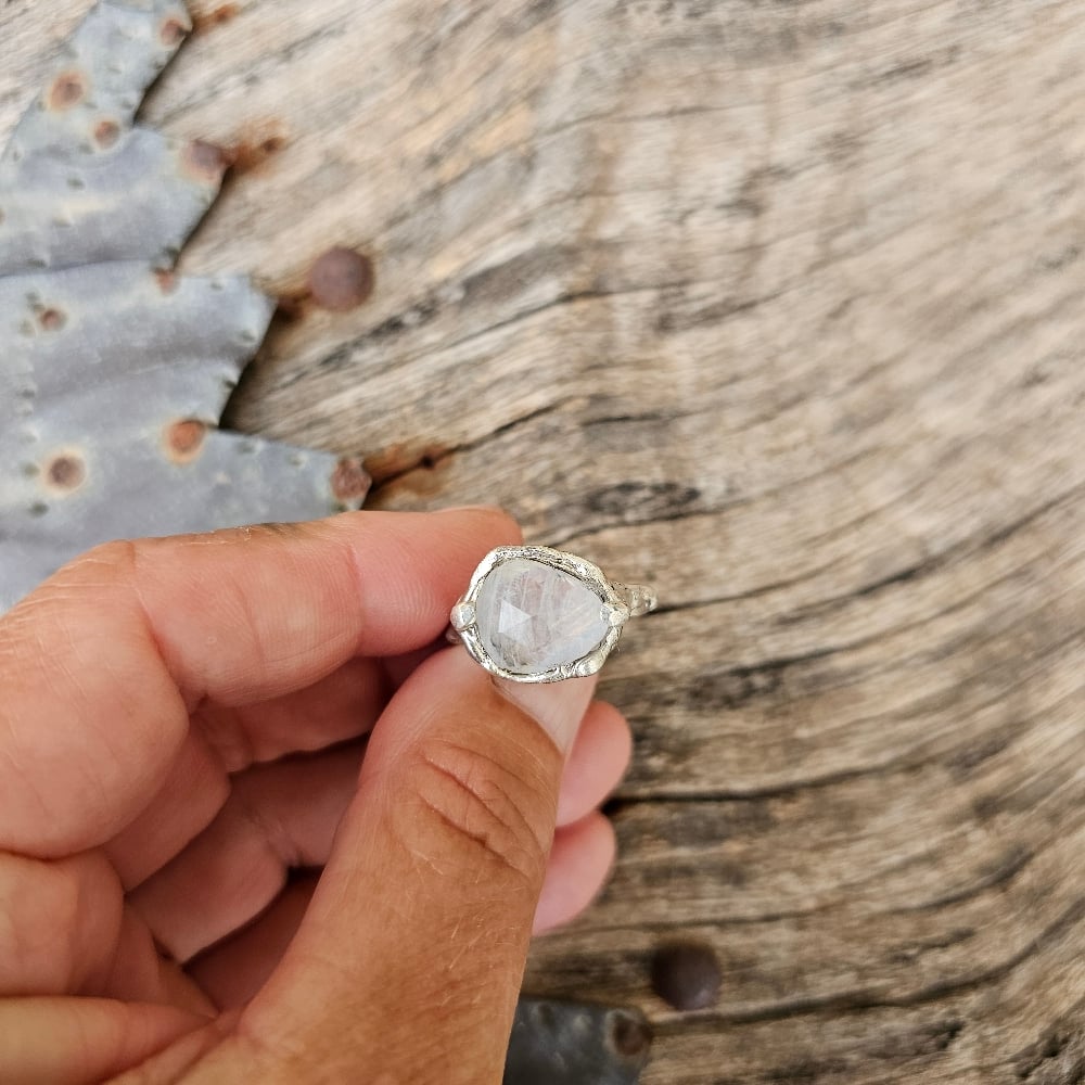 Sterling silver ring set with a faceted rainbow moonstone made in my signature wabi sabi aesthetic.
