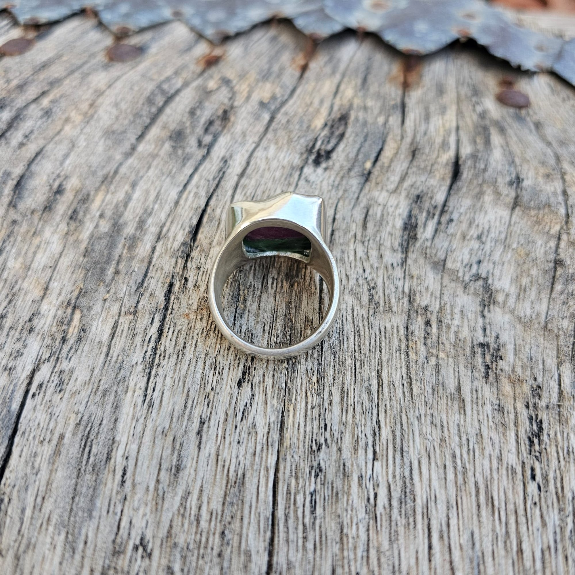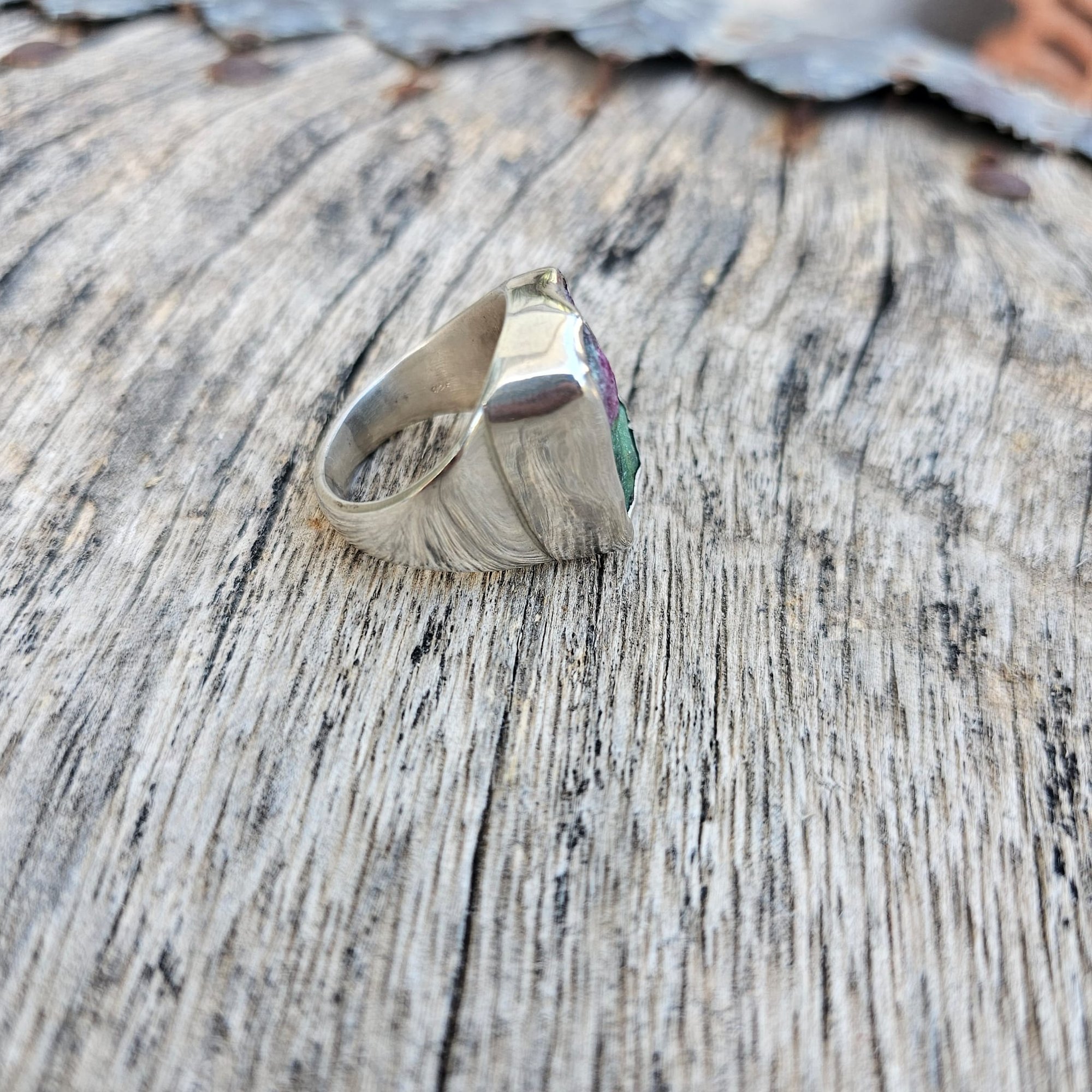 A nice piece of rectangular shaped rough ruby soizite organically set in sterlng silver in my signature raw style aesthetic.
