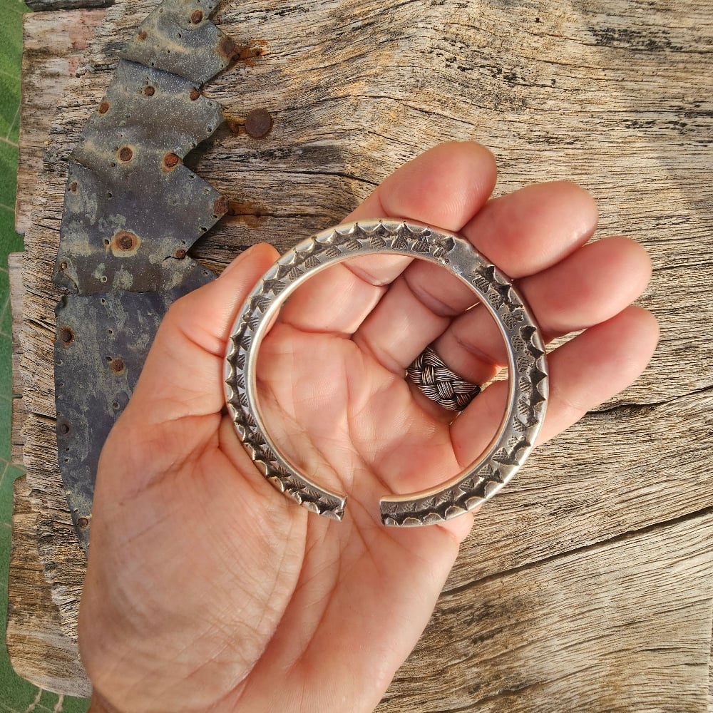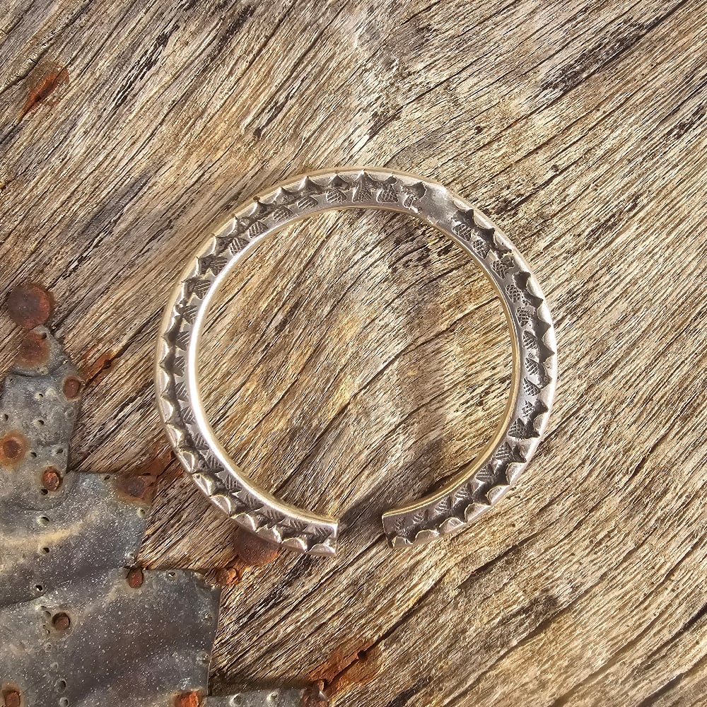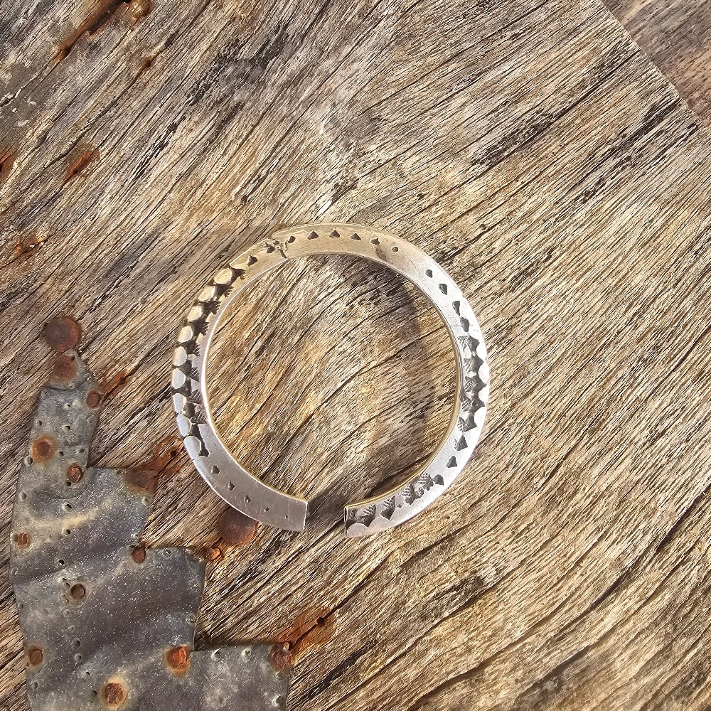 A very old solid silver Indian bangle that has had extensive wear and has signs of having been repaired once or twice but is surprisingly very comfortable to wear.