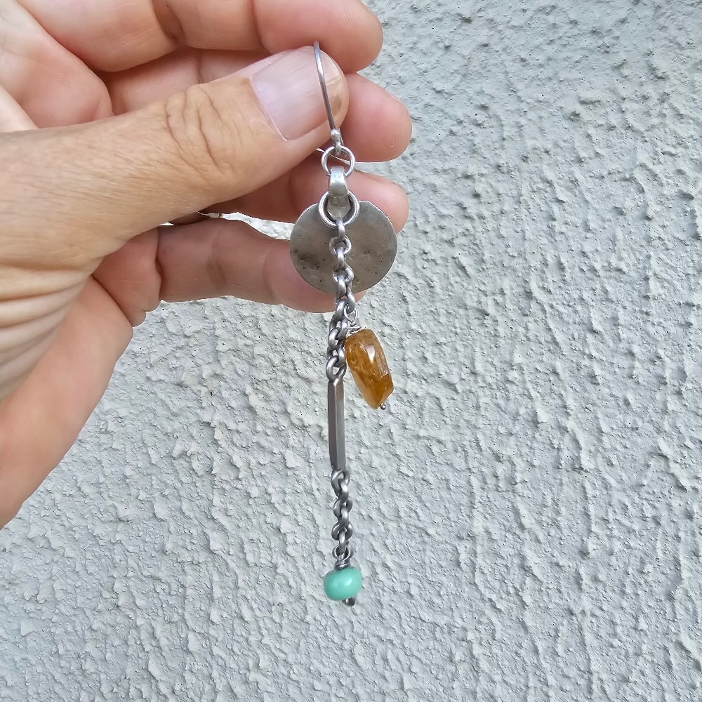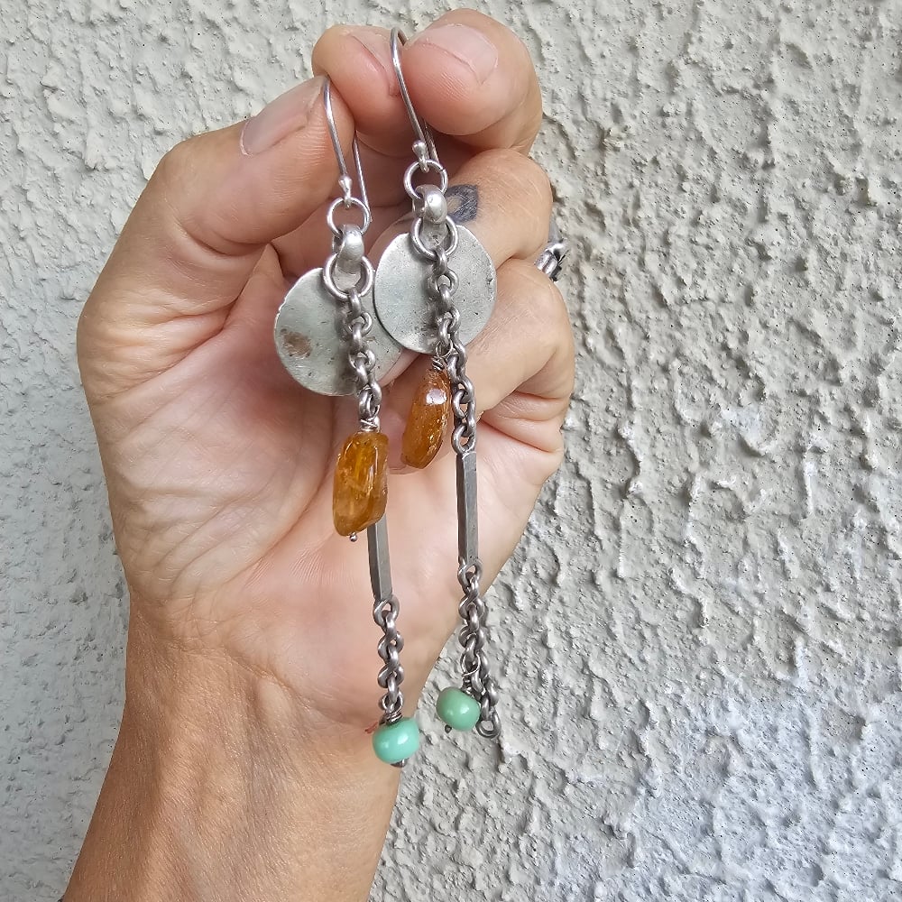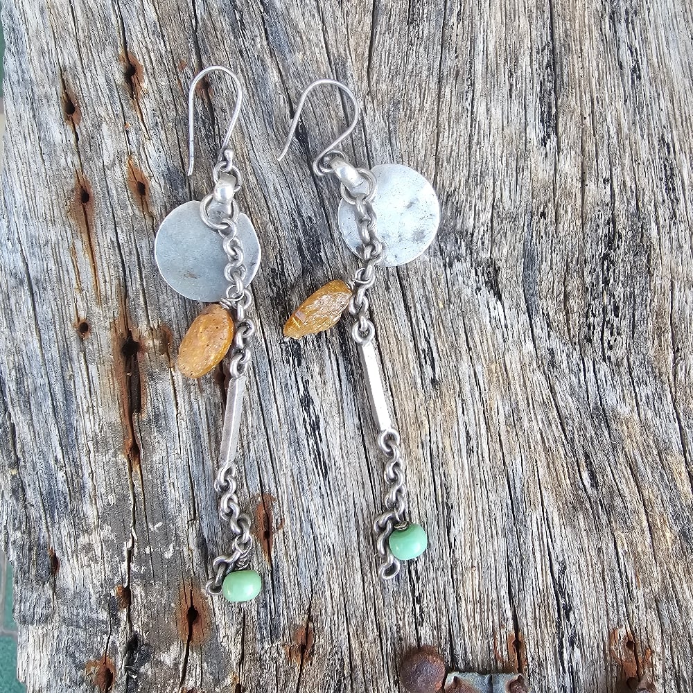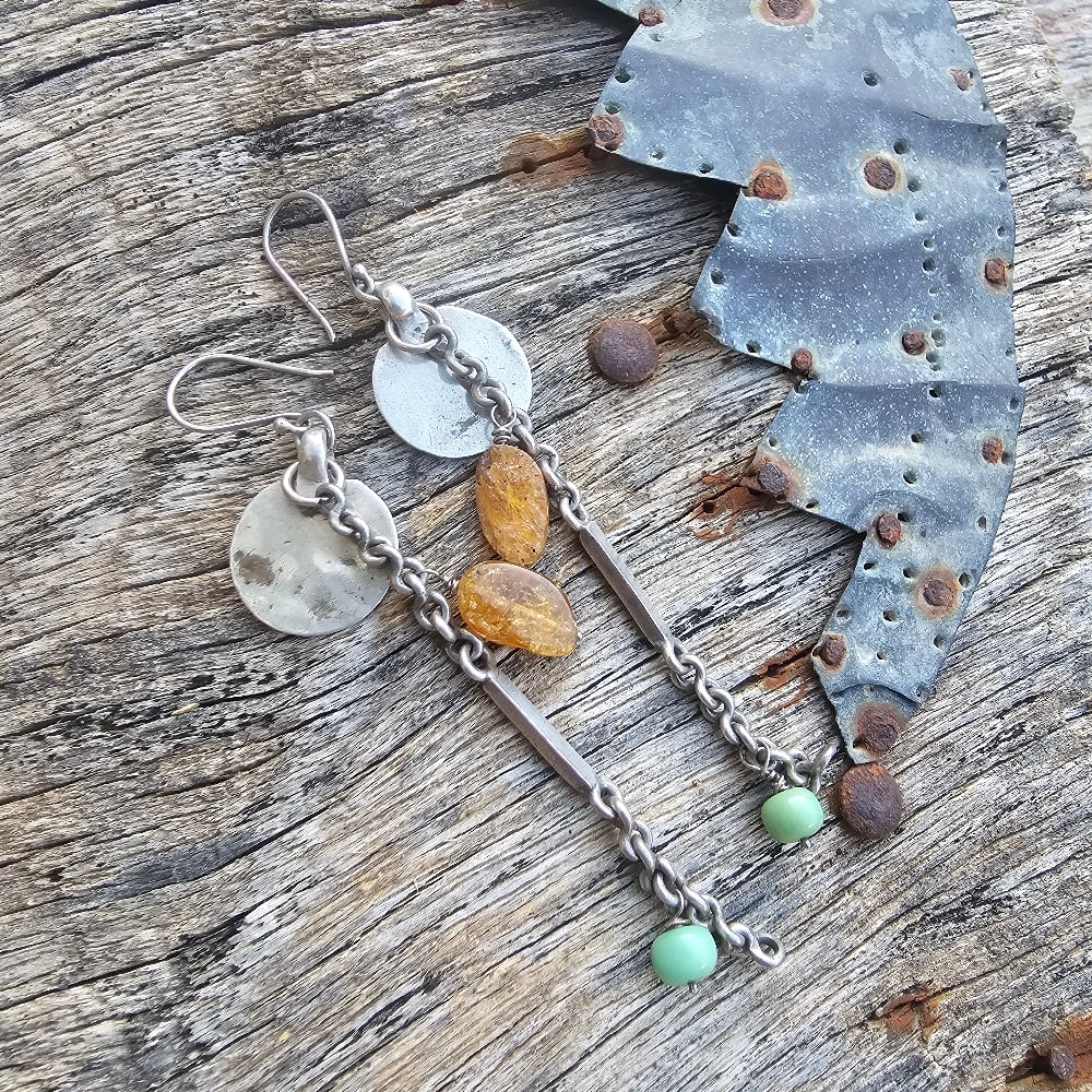 Vintage silver disks and chain embellished with yellow tourmaline and a hint of chrysoprase.